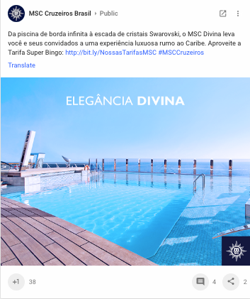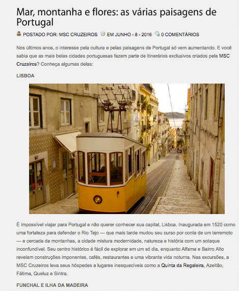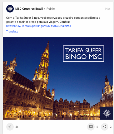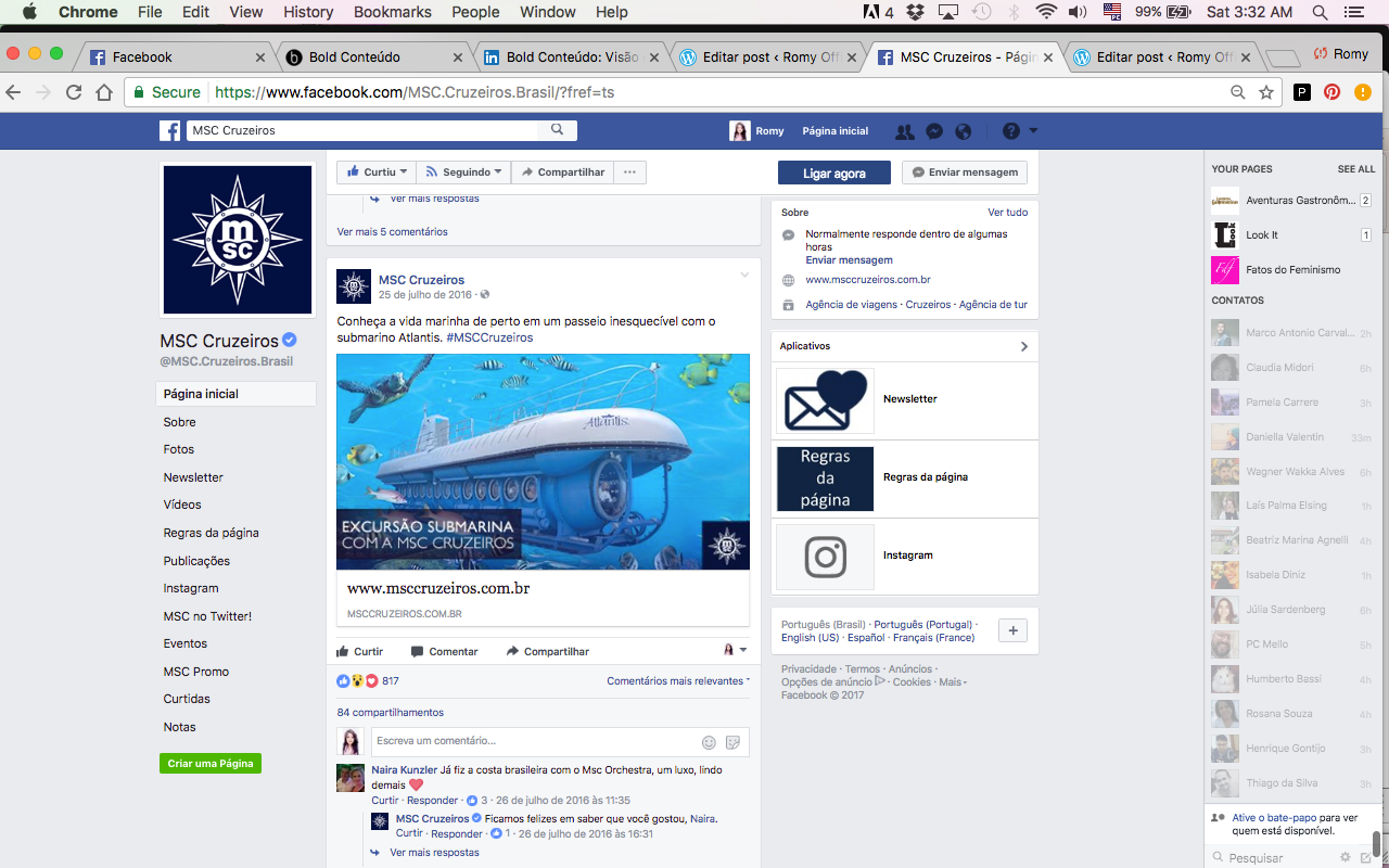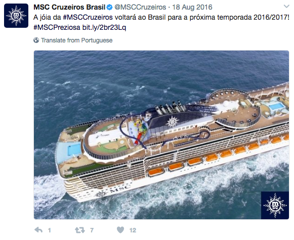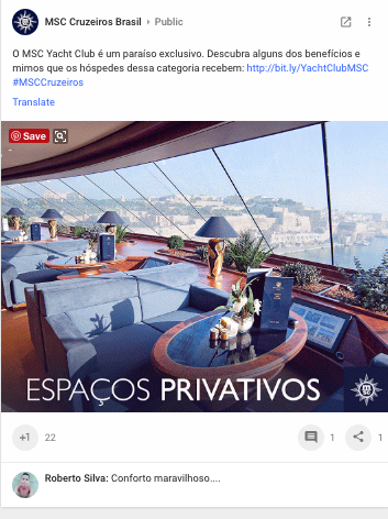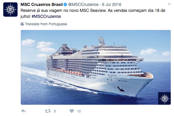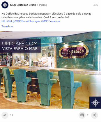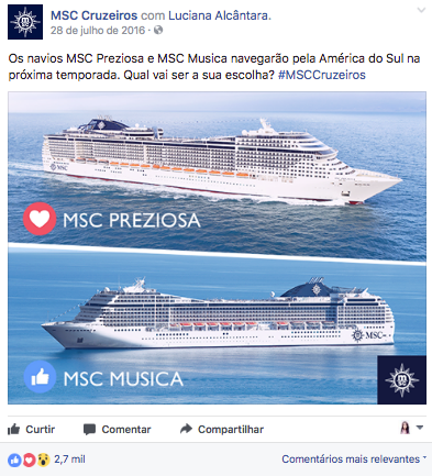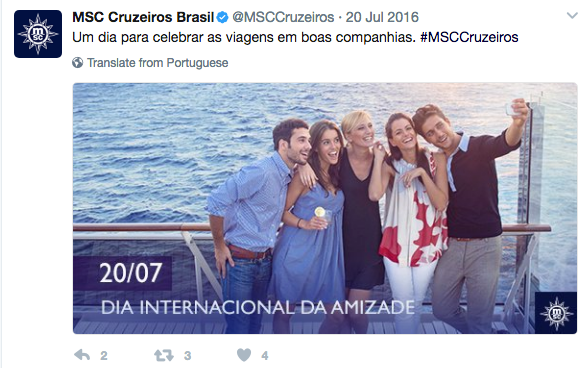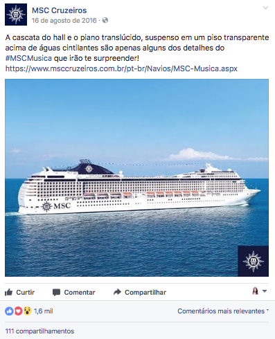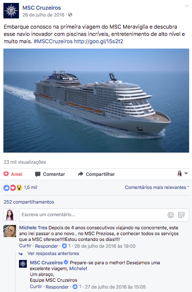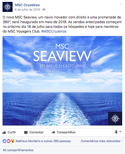 MSC Cruzeiros BrasilRomy Arita6 de mai. de 20171 min de leituraAtualizado: 27 de set. de 2025Social Media de MSC Cruzeiros: Facebook, Blog, Twitter, Google Plus. Atendimento, Community Management, sugestão de pautas, Research & Insights.